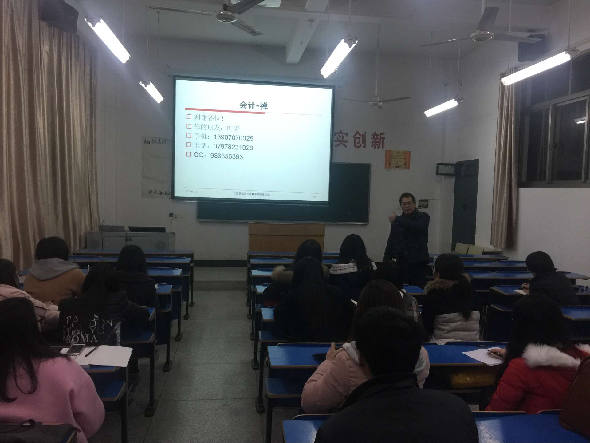 随后,叶青老师根据自己的经历,开展了以“会计——禅”为主题的讲座。他结合自身的创业过程和职业选择,阐述了对会计这门职业的认识和对作为会计专业学生的我们在求学道路和职业规划上的一些建议。