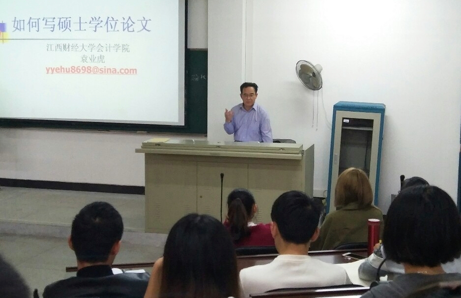 10月20日下午,江西财经大学会计学院副院长袁业虎教授应邀为商学院会计硕士及导师作了题为《如何写硕士学位论文》、《基于创业型人才培养的财务管理学科规划与教学模式改革》的学术讲座。