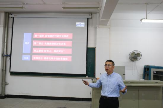 学术论坛活动共分两个阶段进行,首先,深圳市兆驰股份有限公司严志荣副总裁以“兆驰股份的财务共享思考与实践”为题做了一场精彩的学术报告。严总在报告中提出后信息时代企业所面临的焦虑,随后分享了兆驰股份有限公司为应对后信息时代的挑战,从多层面、多渠道进行创新以及财务共享理念。会场气氛活跃,严总饱满热情诙谐幽默的讲授,让同学们受益匪浅。