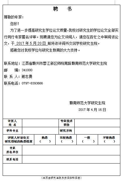 4.提交论文的同时,填写好《赣南师范大学硕士学位论文评阅书》(见附件6)“论文题目”与“学科专业”两个栏目内容,且不填写其他任何信息,用16K纸双面打印(排版顺序:封面—内页1—内页2—封底),一式两份,夹在论文封面下与论文一起提交。